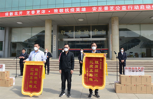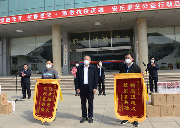 4月18日上午,景芝酒業公司黨委、景芝白酒公司聯合景芝鎮黨委,在景芝酒業文化中心前廣場,隆重舉行“疫散花開 芝香更濃·致敬抗疫英雄 安丘景芝公益行動啟動儀式”。