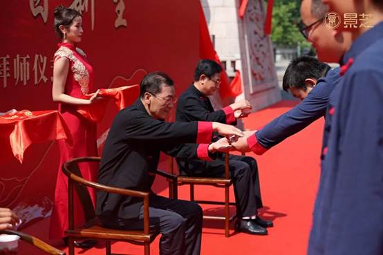 在正式的傳統拜師禮開始前,4個層級60余位師徒虔心敬拜中華人類釀酒始祖大舜,表達景酒匠人對先祖的敬重感恩,共同祈愿景芝白酒基業長青,美酒世代飄香。